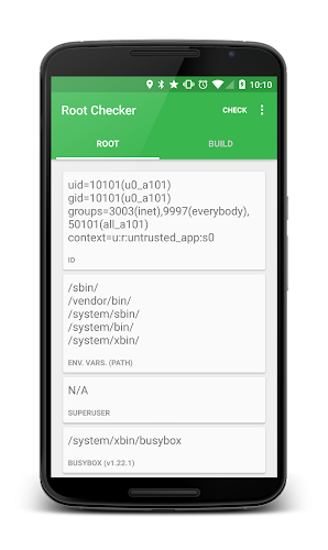 : Root Checker was made for users to easily check for root user access(uid = 0) on their phones!This application, Root Checker, will allow the user to confirm they have proper root ( superuser ) access configured and operational.